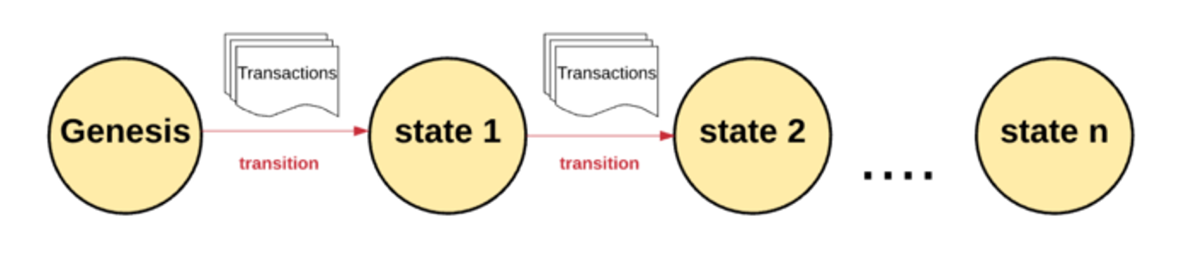 네트워크에 트랜잭션이 발생하기 전인 Genesis state로 시작하여 트랜잭션이 실행되면 Final state로 전환됨 어느 한 시점에서 Final state는 이더리움 네트워크의 현재 상태(Current state)를 나타냄
