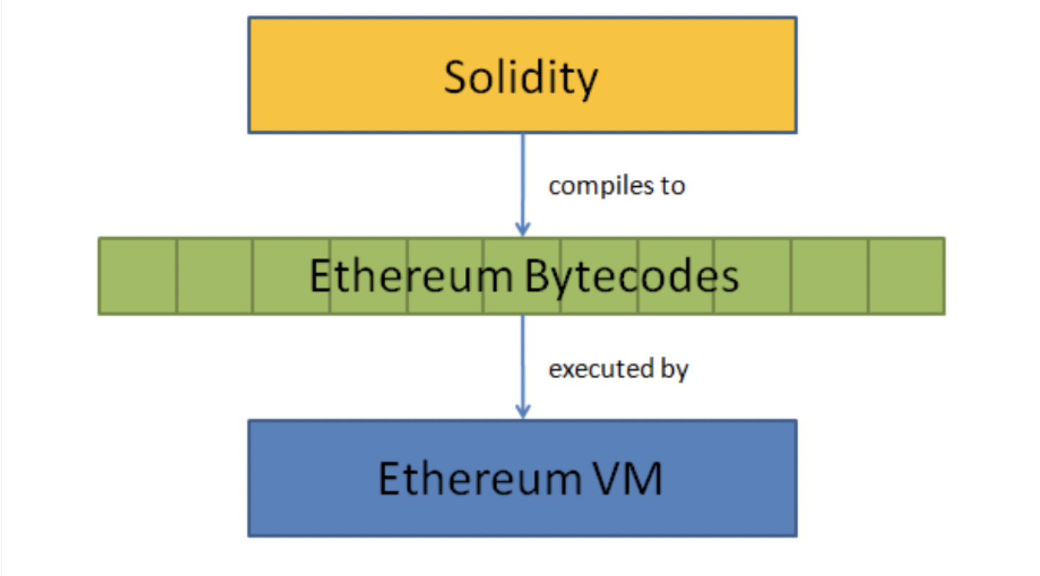 솔리디티 코드가 컴파일러에 의해 Ethereum Bytecode라 불리는 기계어로 만들어지고, 이 바이트코드가 EVM 에서 실행된다.