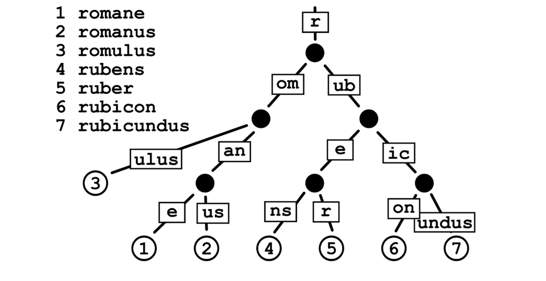 1번부터 7번까지의 단어가 있고, 그 단어를 모두 기록하는 것보다 단어와 단어 사이에 공통적인 부분을 공유함으로써 공간을 절약할 수 있게 된다. r노드가 1~7번 단어에 모두 공통되어 포함돼 있기 때문에 루트 노드가 됨. 이를 이더리움 블록체인에 적용하게 되면 아래 나오게 될 확장 패트리샤 트리와 이어지게 됨.