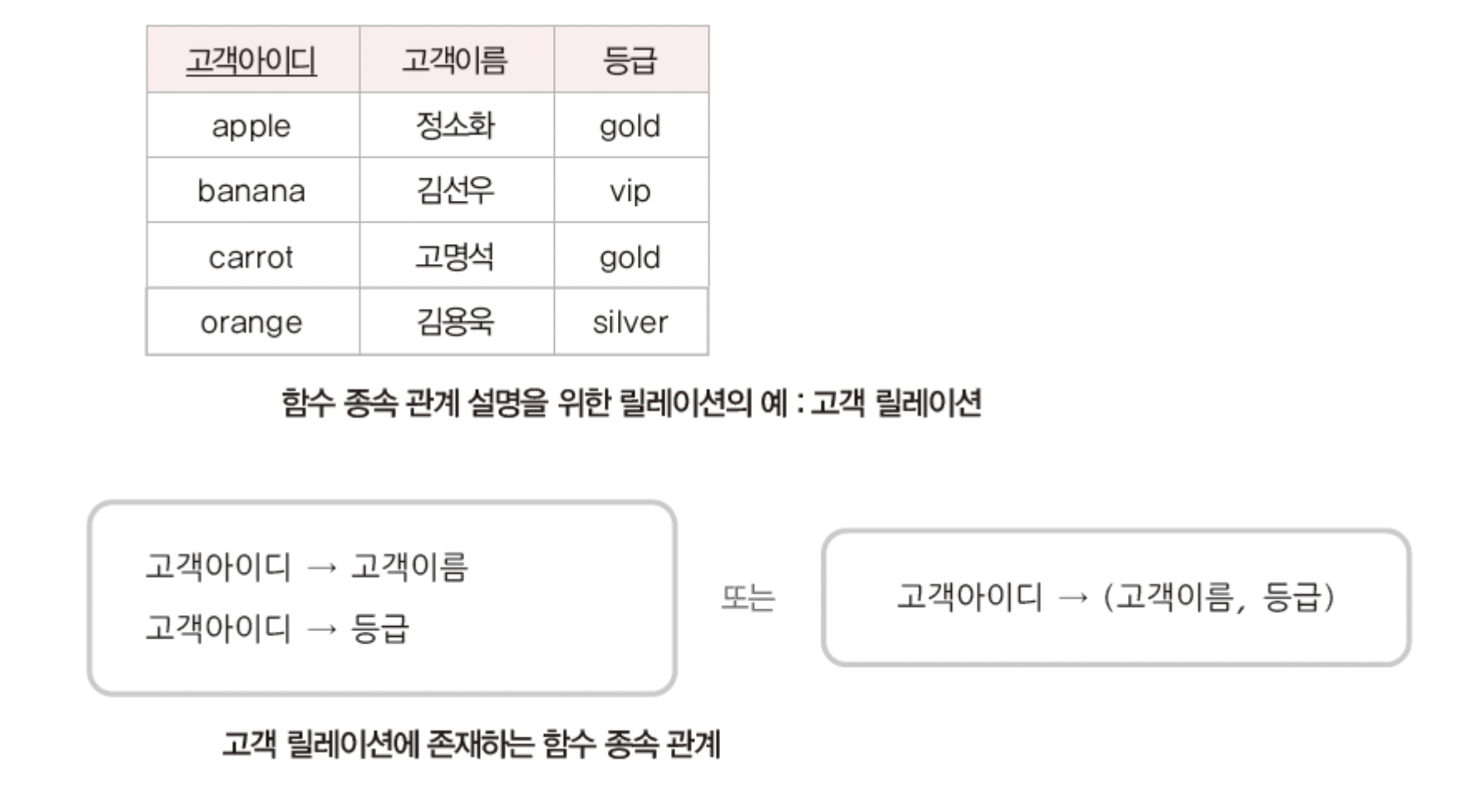 - 각 고객아이디 속성 값에 대응되는 고객이름 속성과 등급 속성이 단 하나이므로 고객 아이디가 고객이름과 등급을 결정한다고 볼 수 있음.