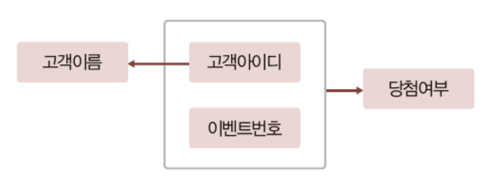 - {고객아이디 , 이벤트번호} 속성집합은 당첨여부 속성을 유일하게 결정